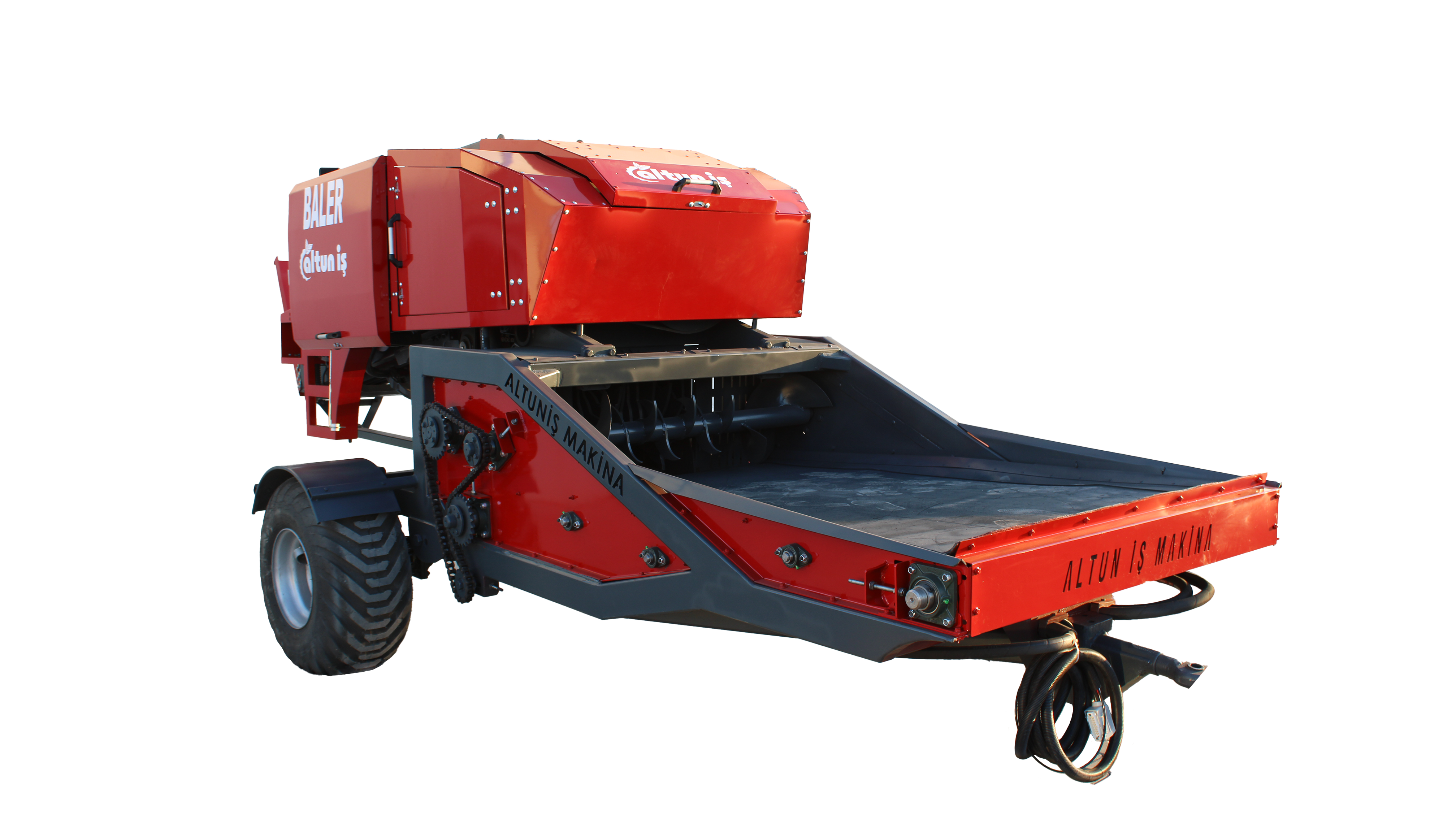 “Biçerdöver Arkası Balya Makinesi” BALER-B modeli, üç ipli prizmatik bir balya makinesi olarak tasarlanmıştır. Bu makine, buğday, arpa ve benzeri tahıl saplarını bir parçalayıcı üniteden geçirerek işler ve ardından bir ip bağlama ünitesiyle bağlayıp balya haline getirir. Makine, biçerdöverin arkasının alt kısmına monte edilerek biçerdöverle birlikte çalışır ve biçerdövere şase yardımıyla bağlanır. Saplar, sırasıyla helezonik toplama düzeni, bantlı toplama düzeni ve balya yapma ünitesine bant yardımıyla gönderilir. Balya odasının genişliği ve yüksekliği sabit olup, balyanın uzunluğu 400 ile 1800 mm arasında ayarlanabilir