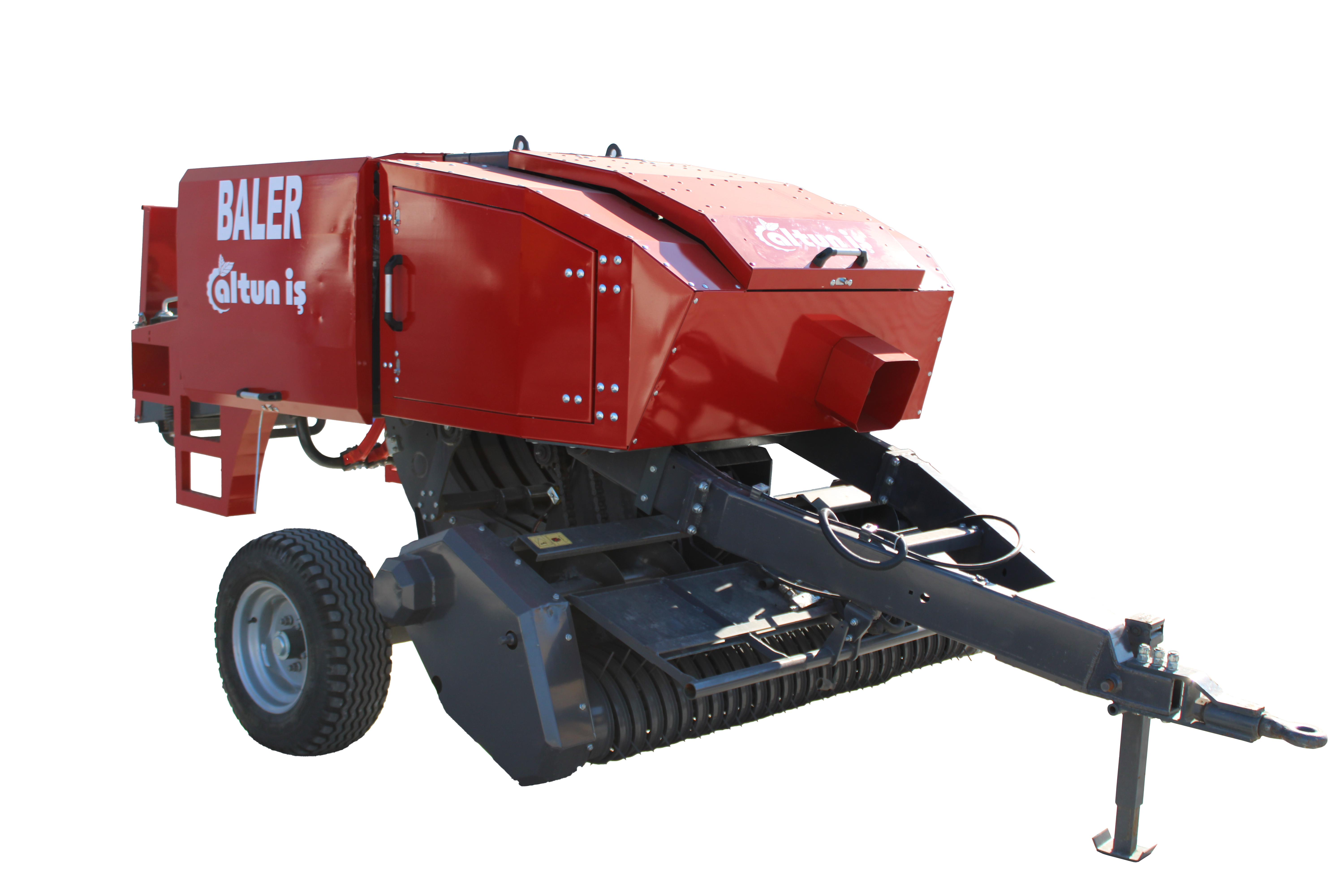 "Traktör Arkası Balya Makinesi" BALER-T modeli, üç ipli prizmatik bir balya makinesi olarak tasarlanmıştır. Bu makine, buğday, arpa ve benzeri tahıl saplarını bir parçalayıcı üniteden geçirerek işler ve ardından bir ip bağlama ünitesi ile bağlayıp balya haline getirir. Çeki demiri aracılığıyla traktöre bağlanan bu balya makinesi, traktörün kuyruk milinden aldığı güçle çalışır. 191 cm genişliğinde iç içe tırmıklara sahip olan bu makine, ortadan pistonlu bir yapıdadır. Traktörün tekerlek izi üzerinde çekilen makine, dar alanlarda yüksek manevra kabiliyetine sahiptir.